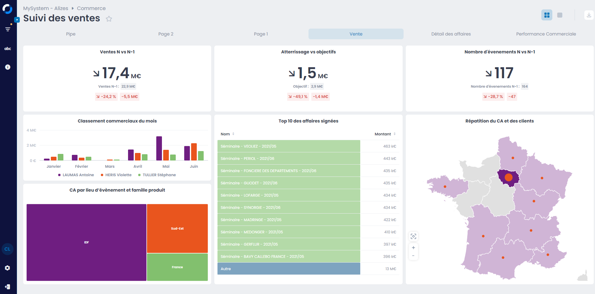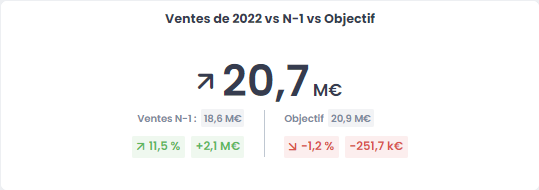 Désormais, en plus de la comparaison habituelle par rapport à la période précédente (N-1), vous pouvez également comparer votre KPI à un objectif prédéfini (par exemple : le volume des ventes). Cela vous permet en un clin d’œil de déterminer si vous êtes aligné avec votre objectif et de suivre votre évolution par rapport à la période précédente. Cette double comparaison des indicateurs simplifie ainsi le processus d’analyse et vous permet de prendre des décisions mieux éclairées.