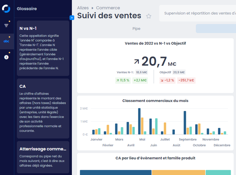 Le volet Glossaire offre désormais aux concepteurs de tableaux de bord la possibilité d'intégrer, de manière illimitée, des définitions pour chaque terme employé dans le rapport ; facilitant ainsi la compréhension des indicateurs par tous les lecteurs du tableau de bord. De même, le volet « Information » permet d'ajouter des éléments de contextualisation au tableau de bord, offrant ainsi aux utilisateurs une vision claire de son utilité et de sa pertinence. La fonction rétractable du volet vous permet par ailleurs d’optimiser l’affichage et de libérer de l’espace pour vos tableaux de bord.