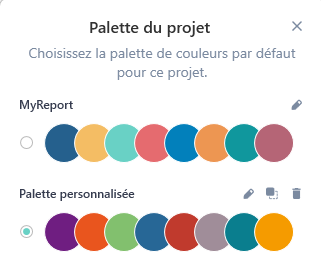 Personnalisez vos tableaux de bord en paramétrant et en intégrant votre charte graphique à MyReport. La palette étendue de 8 couleurs est entièrement personnalisable et vous pouvez également ajouter votre propre palette personnalisée. Vous créez ainsi des tableaux de bord uniques et en accord avec votre identité visuelle.